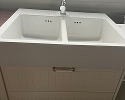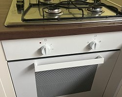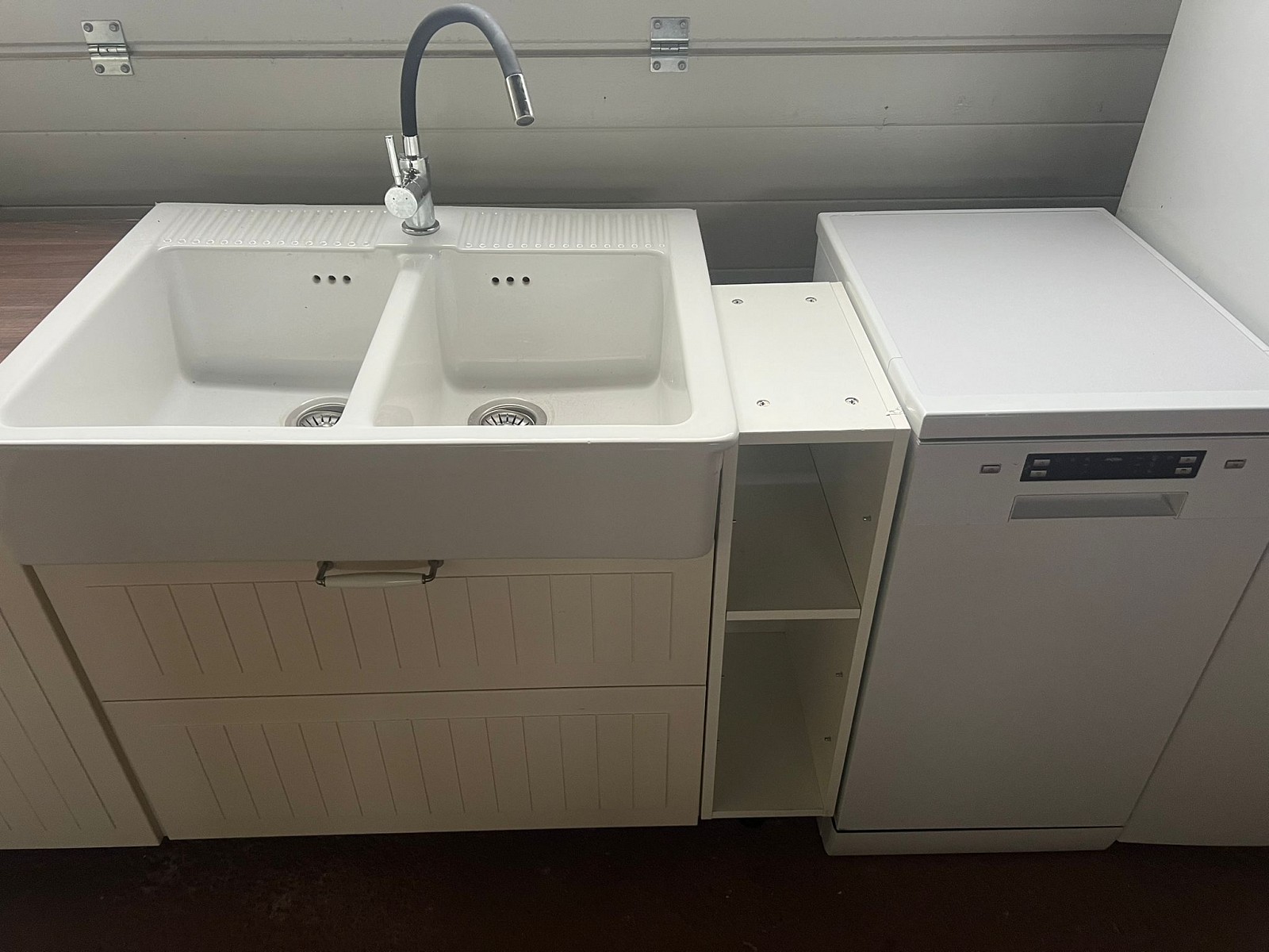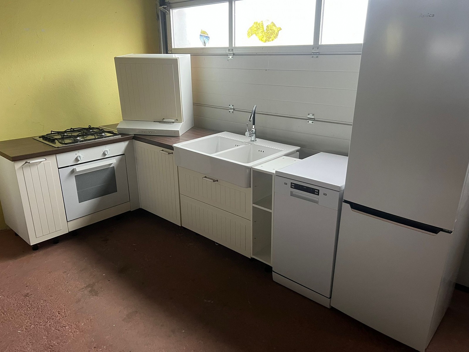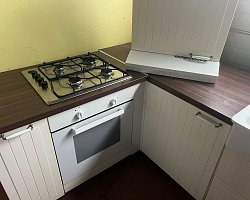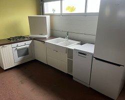 Součástí: Horkovzdušná trouba, plynová deska, myčka, digestoř, keramický dřez, baterie, lednice a mrazák